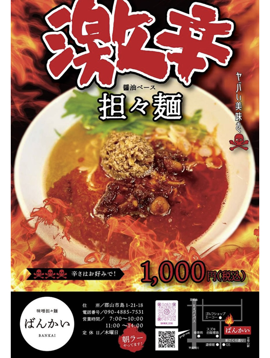 郡山市島「味噌担々麺ばんかい」では、醤油ベースの「激辛担々麺」(1,000円)が今夏登場以来ジワジワと人気。特製辛味がクリーミーなゴマペーストに包まれ、まろやかな辛味に。卓上の山椒をでシビ辛味変もおすすめ。辛党は辛さMAXがおすすめ。看板メニューの名物「味噌担々麺」(1,000円)同様11時から14時までの提供。なお、毎日朝7時から10時は、チャーシュー入り黒醤油、白醤油それぞれ一杯700円の朝ラーが評判。定休木曜。