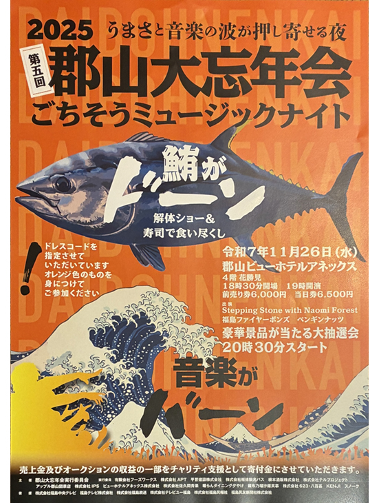 11月26日(水)「郡山ビューホテルアネックス」4階花勝見を会場に第五回「郡山大忘年会」が開催。飲食はフリーフード、フリードリンク。ミュージシャンの演奏や楽しいアトラクション、豪華景品が当たる大抽選会も用意。入場に関してはドレスコードを設定、今年はオレンジ色のアイテムを身に付けて来場を。受付にてドレスコード対応缶バッジも販売予定。開場/18時30分 開演/19時 前売り券6,000円(当日券6,500円※上限人数に達した場合は当日券の販売は無い)。