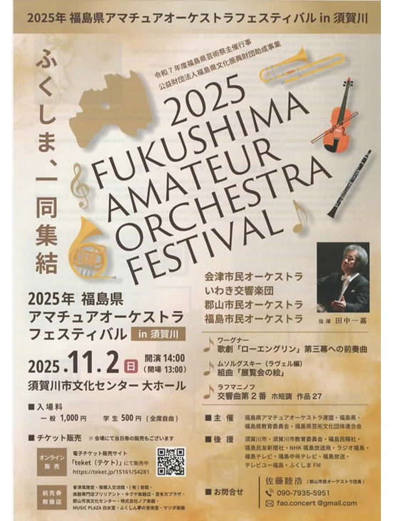 県アマチュアオーケストラ連盟主催による郡山、福島、いわき、会津の県内4団体が集結した合同演奏会「福島県アマチュアオーケストラフェスティバルin須賀川」は、11月2日(日)14時開演、須賀川市民文化センター大ホールで開催。演奏曲目は、ラフマニノフ交響曲第2番ホ短調作品27、ムソルグスキー組曲「展覧会の絵」ほか。指揮者田中一嘉。料金は、一般1,000円、学生500円(全席自由)。けんしん郡山文化センター、ノア楽器、teketほかで発売中。