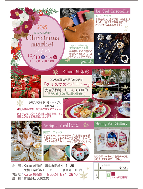 「5つのお店のクリスマスマーケット」は、12月13日(土)14日(日)11時から16時までKaisei紅茶館(郡山市開成4-1-25大桃工業ビル)で開催。参加店は、メルフォード(英国アンティーク雑貨)、gem.R(コットンパールと天然石のアクセサリー)、ル シエル アンソレイエ(レザークラフト)、ハニーアートギャラリー(Xmasカード)、Kaisei紅茶館では、Xmasハイティー(オードブル・食事・スイーツ・紅茶・3,800円・完全予約制の前売券販売中)を提供。