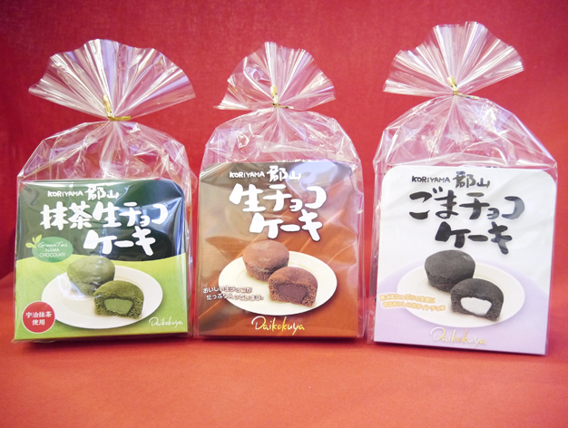 「郡山銘菓庵 大黒屋」冬の人気商品「郡山生チョコケーキ」は、ガーナ産カカオを原料に作り上げた高級クーベルチュールチョコに、生クリームをたっぷり使用した特製生チョコが入った、食べやすいサイズのトリュフケーキ。「郡山生チョコケーキ」、「郡山ごまチョコケーキ」、「郡山抹茶生チョコケーキ」、「郡山いちご生チョコケーキ」の4種類あり。価格は4個入り699円税込ほか。中町本店・JR郡山駅構内売店・ヨークベニマル・ザ・モール郡山店などで発売中。