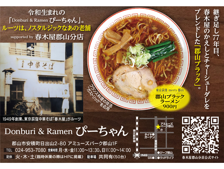 年末から臨時休業していた「Donburi&Ramen ぴーちゃん」(安積町日出山アミューズパーク郡山1階)が厚みを増したスープで3月13日金曜日から営業再開。営業は月・水・金・日。レジェンド春木屋をルーツに、春木屋郡山分店クオリティによる上質な自家製素材の店。老若男女が利用しやすいテーブル席、座敷席あり。お子様ラーメンもあり。