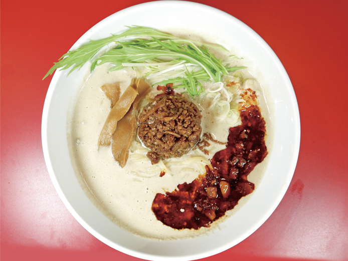 風味濃厚なごま味噌ダレに、食べるラー油、特製肉味噌をのせた名物「味噌担々麺」。ライス(100円)もマストな一杯。