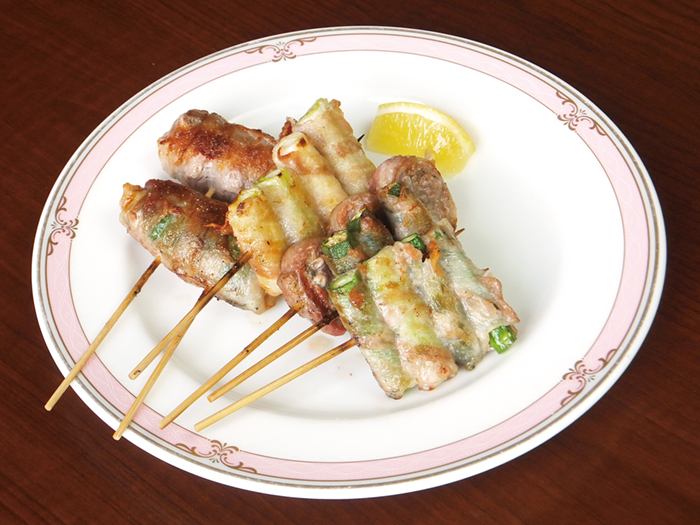 写真の串焼焼は、アスパラ巻、シソ巻、ねぎ巻(各250円)、ピーマン巻(500円)。野菜に薄い豚バラ肉を巻いて炭火で焼いている。さらに、エビのチリソースも人気。宴会料理は4400円から予約を受付中。