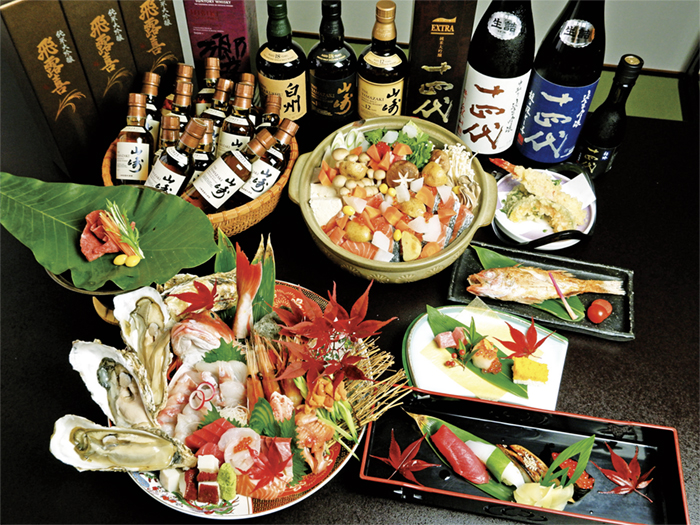 ▲宴会コースの一例、希少な銘酒やウイスキーも充実