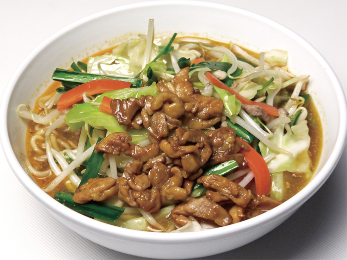 名物「ごまみそラーメン」に、野菜1日摂取目標の2/3を使用した「野菜大盛」、秘伝タレ「味付とり肉」入り。麺は自家製「竹踏み麺」。