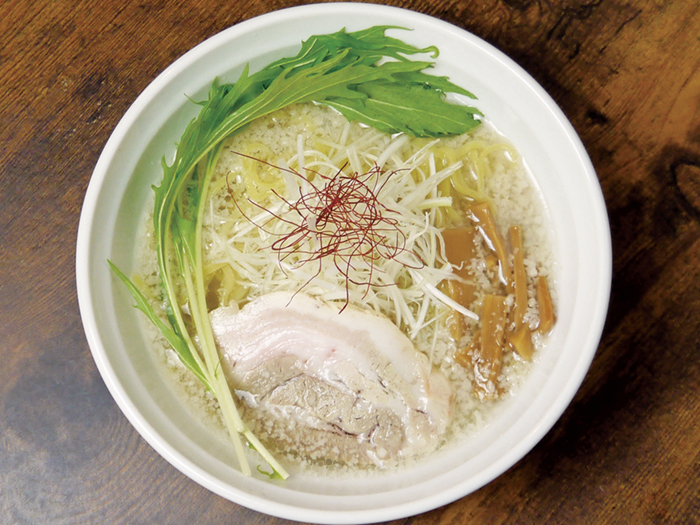 郡山では稀有な、会津山塩を用いた「しおらぁめん」。会津山塩の優しい甘みに背脂のコクと甘みをプラスした意欲的な一杯。
