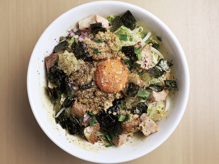 コシのあるモッチリした角平極太麺が、特製ブラック醤油と多彩な具材に絡みつく。ユニークな郡山発ブラックなまぜそばをぜひ。
