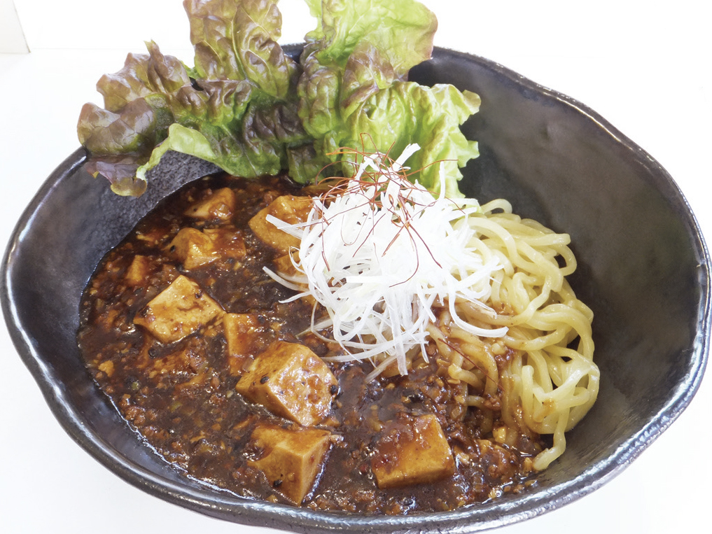 赤黒いビジュアルを持つ名物まぜそば。特製麻婆豆腐と、もちもち中太麺を豪快に混ぜて堪能する、甘辛濃厚スパイシーな味わい。