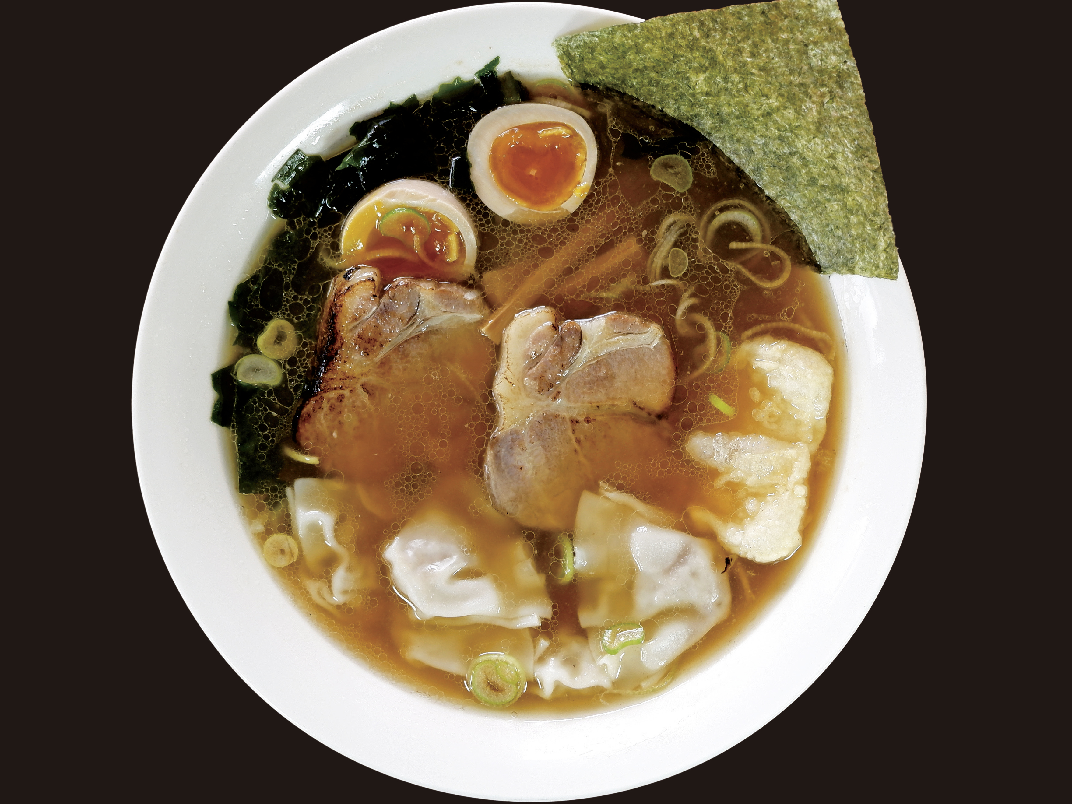 ほろほろとやわらかい厚切りチャーシュー、外はカリッと香ばしく、中はとろりとした揚げ餅、ワンタン、煮卵入りラーメン。