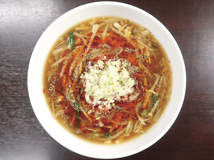 自家製香辣油と黒胡椒、四川山椒「花椒・ファジャオ」の香りと辛味に酸味を効かせた一杯。とろみスープが中麺とよく合う。